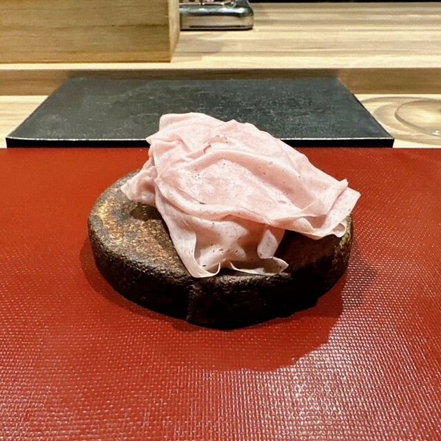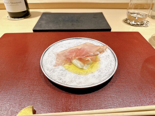 ハム巻き(勝浦産赤身、鮎のいしる、山わさび、ゆめぴりか)