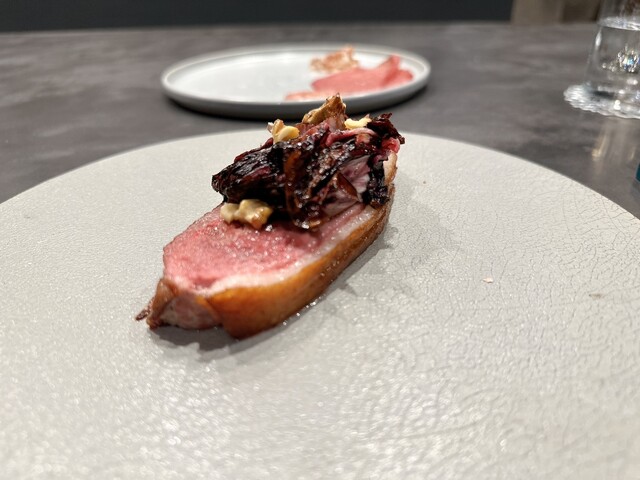 帯広産和田ごぼう、アレッタのストゥファート、黒胡椒と赤ワインのソースで。