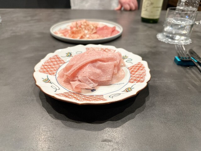前菜や魚、肉料理で構成される第一部、続いてシェフ自慢のスライスしたての自家製ハム、サラミが握り鮨のように提供される第二部、こちらがメインになります。