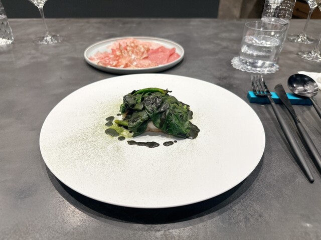 メヌケ&ソテーした生ハム(スープドポワソン、ソテーしたハムと葉玉ねぎ、発酵チンゲンサイのパウダーなど)