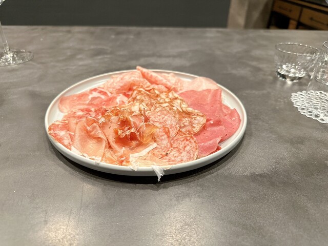 箸休めの自家製サルーミはモルタデッラ、トスカーノ、フィノッキオーナ、ヴェントリチャーナ、コッパ。