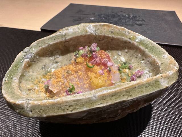 ★北海道の真鯛をサラミで締めたもの。血合は炭でささっと炙る。朝採れのネマガリダケ、瀬戸内のレモンを麹で発酵、シチリアオリーブオイルで和えてグラッパで戻した自家製カラスミをふってあります。