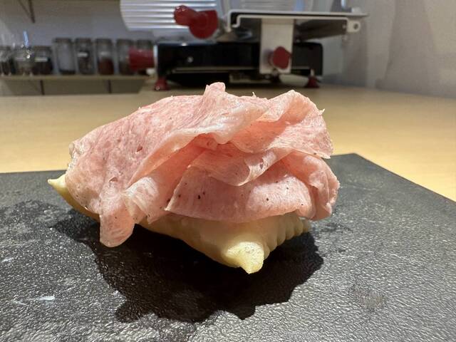 ★揚げパンにモルタレッタ(余市の北島豚)を載せて