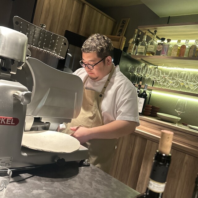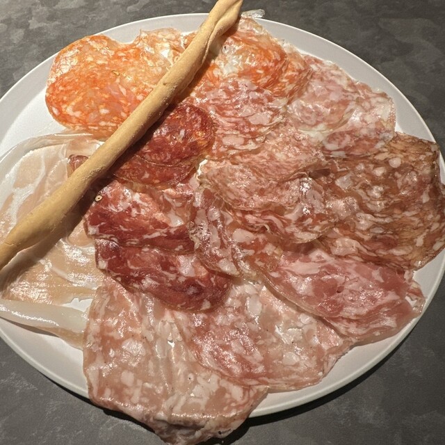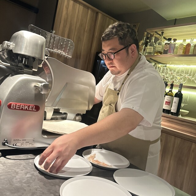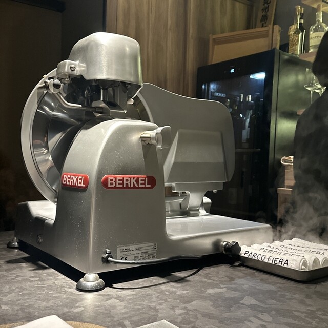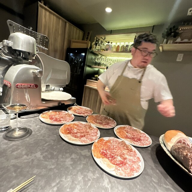 イタリアバーケル社のスライサーで色々なハムやサラミを一枚一枚を薄く丁寧にスライス、皿に並べオリジナルティ溢れる愛情の籠った味を染み染みと楽しむ。