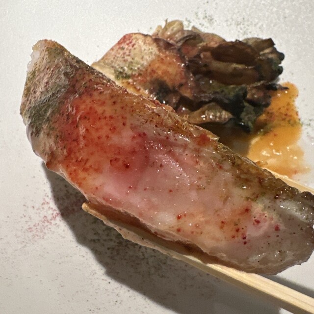 舞茸 ◯羅臼メヌケ 炭火焼き ブイヤベース 発酵したビーツとほうれん草