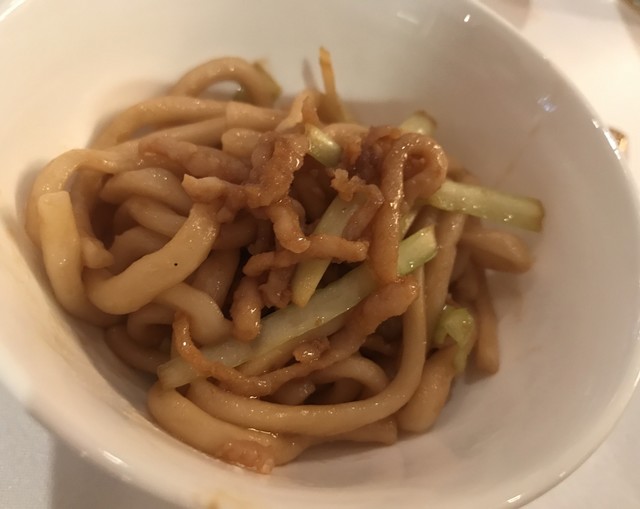 焼き上がった北京ダックは、テーブル間をグルグルまわって見せるだけで、すぐに切り分けてしまいました。北京ダックは、皮だけのイメージでしたが、身もタップリついてました。