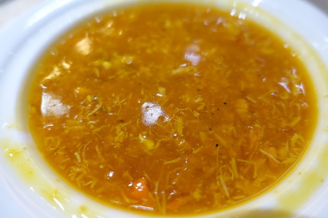 まずはカニ肉とカニみそ入りフカヒレスープ。カレーかと見紛うほどの黄色であり、カニのエキスがとにかく濃厚。カニ味が濃すぎてフカヒレの美点は影を潜めてしまっており、代わりに輪ゴムが入っていても気づかなかったかもしれません。それほど濃厚なスープでした。