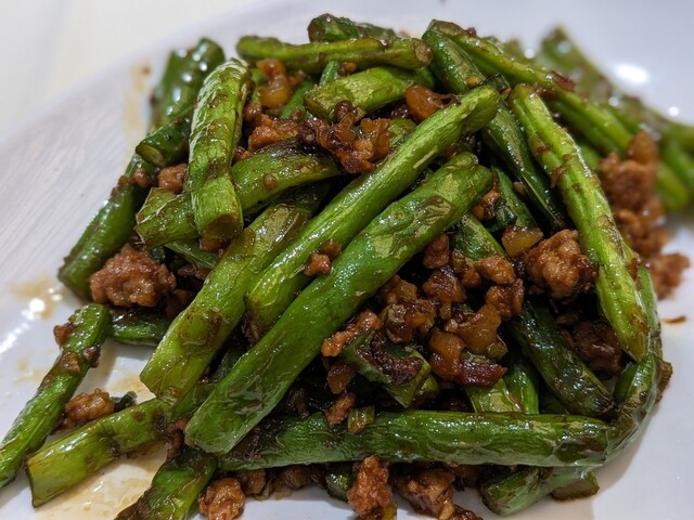 四季豆と挽肉の炒め物。四季豆とは四捨五入するとインゲンなのですが、日本のインゲンに比べると深みがあって後を引く美味しさです。香港に来た際は積極的に注文することにしている料理のひとつです。