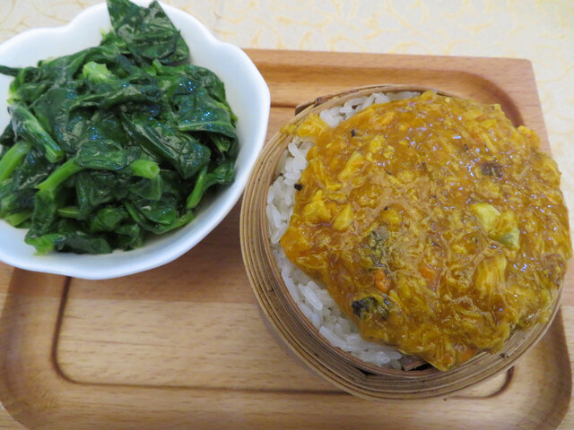 豆苗の炒めものとカニ肉とカニみそのもち米蒸し