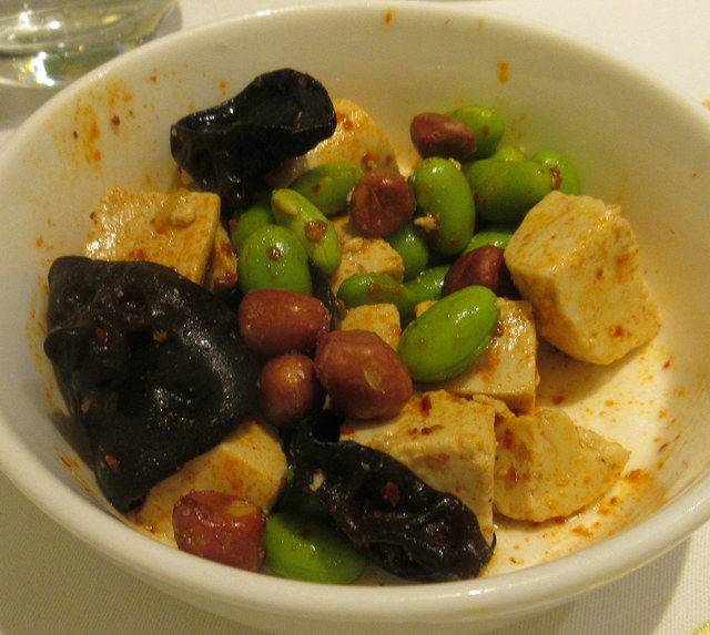 前菜の前に、テーブルに置いてあったつきだしがうまそう。ピーナッツ、枝豆、堅豆腐、木耳がぴりりと辛いソースでまとめられていて、実に美味。これはあたりの予感。