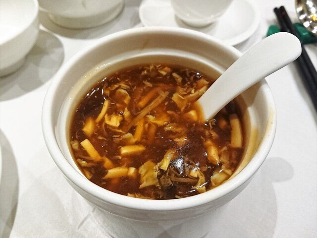 細切りの豆腐、タケノコ、キノコ、肉、湯葉などがたっぷりと入った酸辣湯。まろやかな酸味と醤油のコク、スープの旨みが混然となったしっかりと旨いスープ。