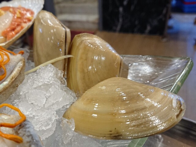 新鮮馬刀貝(活マテ貝)…甘みの濃いマテ貝。醤油ベースにネギ生姜風味のタレがピッタリ。