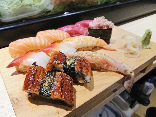 こだわりの魚介は、日本各地から空輸で仕入れたものが中心。北海道産帆立、北海道産ミル貝、北海道産バフンウニ、静岡県産地金目鯛、日本産真鯛、ボタンエビ、活赤貝などもあり。すしめしは、福井県産の米と赤酢。