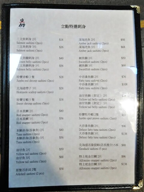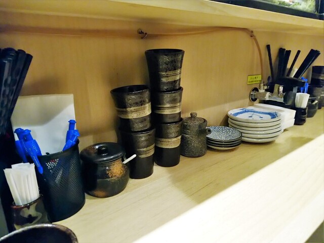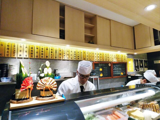 カウンター内の職人さんは全員、襟付きシャツにネクタイ、白衣、和帽子を着用。その背面には寿司ネタ木札(ほぼ日本語)と黒板メニュー(繁体)があって、寿司屋っぽい雰囲気が出ています。