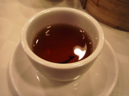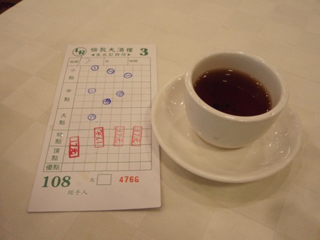 さて、席に座ればサービススタッフがオーダー用のカードとお湯とお茶を置いてくれる。基本はプーアル茶だが、ジャスミン茶もオーダーすれば用意してくれる。せっかくなので本場のプーアル茶を体験。