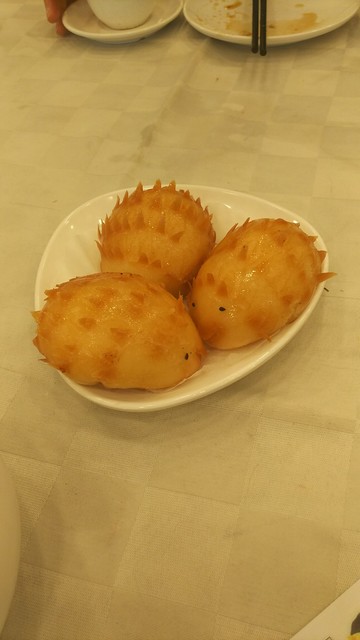 注文はフロアを回っているワゴンを呼び止めて積んである商品を貰うか、注文表に数字を書いて店員さんに渡すとテーブルまで持ってきてくれます。焼売やエビ餃子、大根餅などを頼んでみましたが、いずれも中身がギッチリ詰まっていて、重めの点心でした。カスタード揚げまんがハリネズミの形になっていて可愛かったです(ハリの細工が見事!)