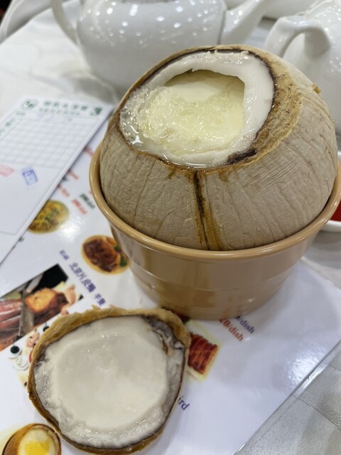 多くのゲストが注文する名物デザート椰皇燉鮮奶。ココナッツをくり抜き中は熱々のプリンが入っています。ツバメの巣も入っているとかなんとかですがちょっと分かりませんでした。濃厚なココナッツの香りと滑らかな食感が特徴的で甘さもかなり控えめ。食べやすいです。
