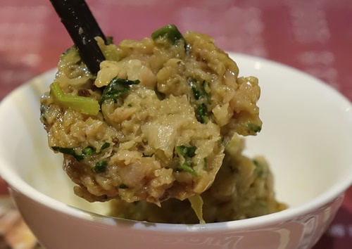 見た目は大きな肉だんごの様ですが、牛肉と蓮などの野菜をだんご状にして蒸したものです