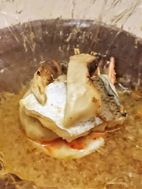 B:秋茄子ときのこ、天使海老と黒ムツのカルタファタ包み 和風ブイヤベース仕立て