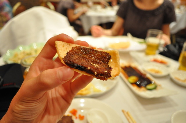 海老せんに牛肉のせ。