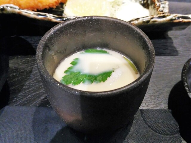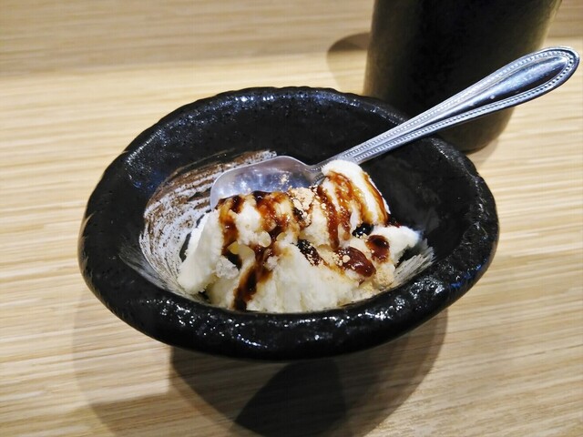 味噌汁はアツアツでダシがきいていておいしく、茶碗蒸しもなめらかでおいしい。デザートのアイスクリームも黒蜜ときな粉をトッピングするなど丁寧な料理が楽しめました。