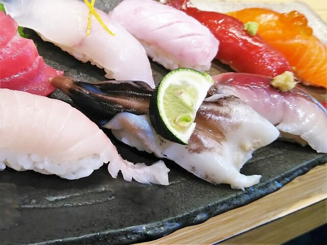 おまかせ寿司は全部で八貫で、中トロ・赤身漬け・鯛・〆鯖・烏賊・鳥貝・サーモン。バラエティーに富んだ内容で、どれもしっかりとおいしい。〆鯖は生感を残した〆具合で脂の乗りもバッチリ。出色だったのは鳥貝。肉厚で独特の香りと旨みが楽しめる上質な一貫。