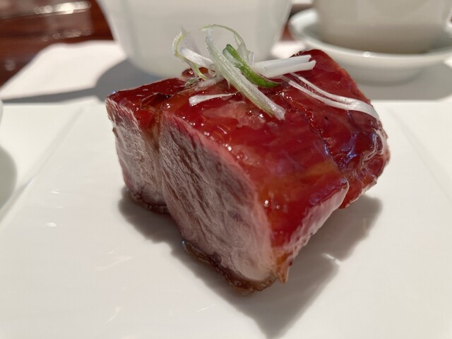 厚切りの巨大チャーシューの表面にほんのりはちみつ。このメニューはアラカルトでオーダーすると、これと同じものが12個(12人分)出てきて、ハーフポーションもあるそう。
