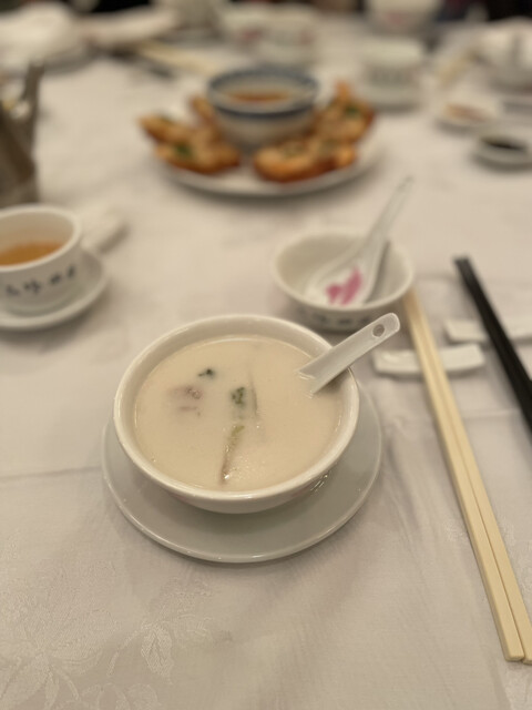 特に印象的だったのは、海老を乗せた揚げパン。甘さと香ばしさのバランスが絶妙で、食感も楽しめました。また、海鮮の旨味がたっぷりと詰まったあんかけ焼きそばは、出汁の深みが素晴らしく、一口ごとに感動。デザートのココナッツスープも、甘さ控えめでさっぱりとした後味が食事を締めくくるのにぴったりでした。
