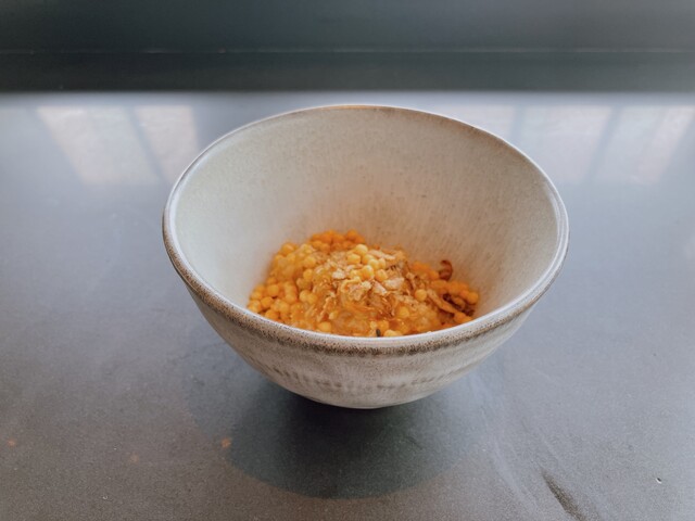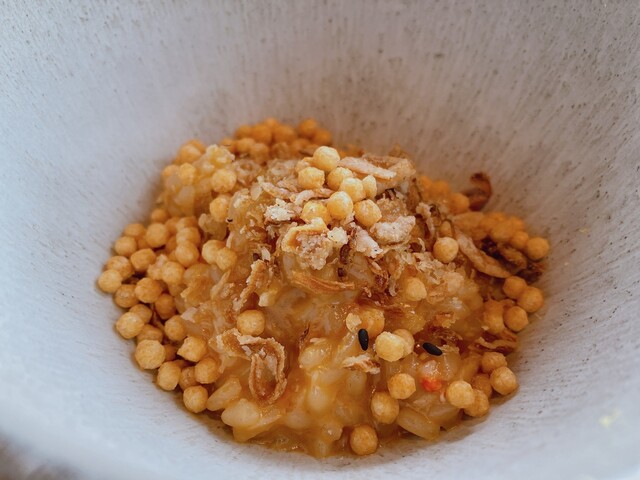 こしひかりを使用。ロブスターソースをベースにリゾットの調理法で仕上げている。ふりかけ的に乾物のホタテとあられで触感をプラス。