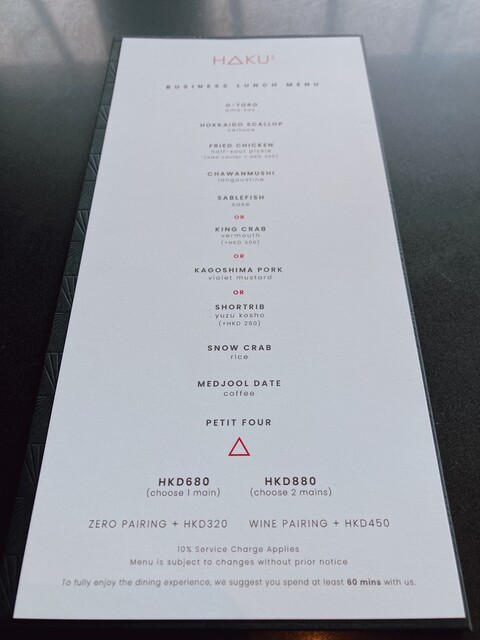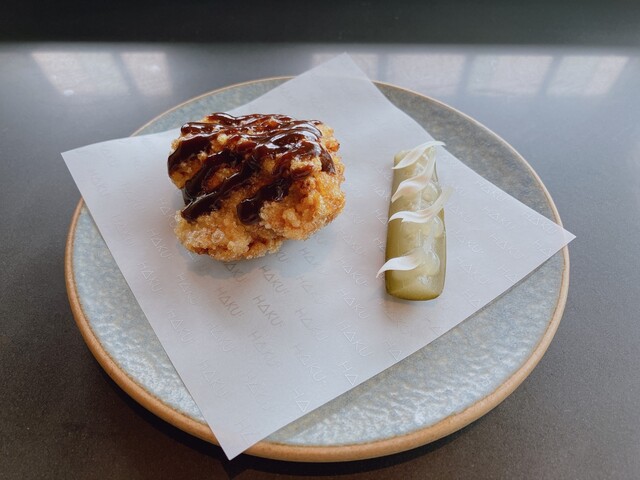 上記のシェフもお休みとのことで、接客してくださったのは香港人のシェフ。なんと40年も和食のレストランにいらしたそうで、寿司も10年以上握っていらっしゃって、HAKUでは魚担当とのことだった。なんと日本語もできる。