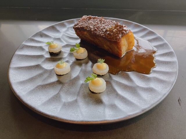 小さなまん丸の大根の下にはシャンパンマッシュルームのソース、上にはマヨネーズから酸味を取り除いたようなソース。