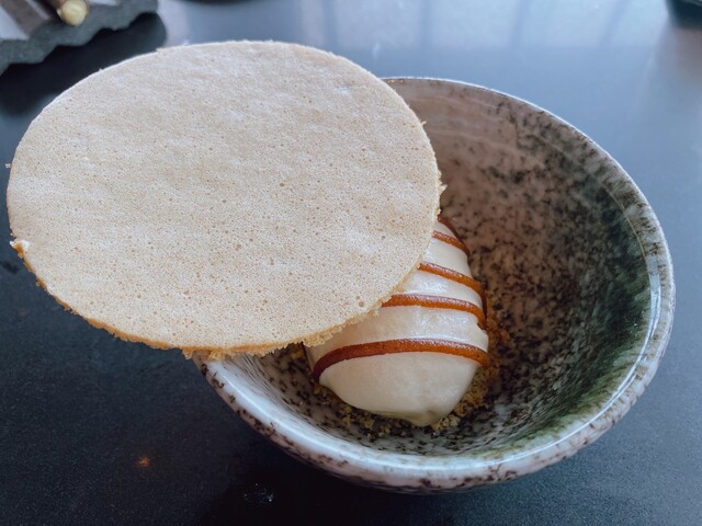 和の味のするメレンゲ?の板が器を覆っている。これを割って、中のアイスクリームと合えながらいただくと、食感のアクセントになるしくみ。