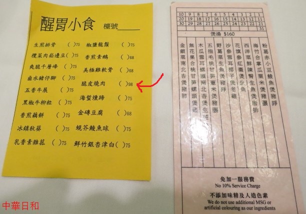 連れが大好物の脆皮焼肉は卓上に置かれた用紙に書き込み、スタッフさんに渡すことで完了。