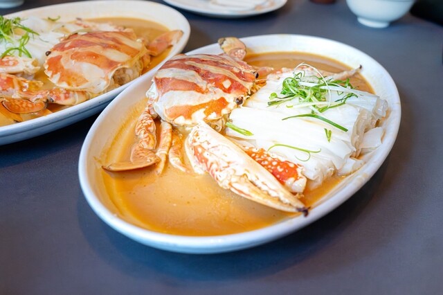 鶏油花彫蛋蒸花蟹(配...
