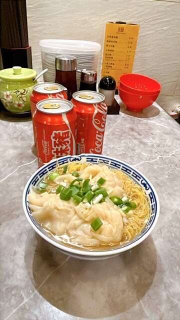 エビワンタンがプリプリで何個もあっておいしい。麺は極細でこしが強く、私は美味しいと思ったけど、同行者は「輪ゴムみたい」と不評だった。コーラがぬるかった。