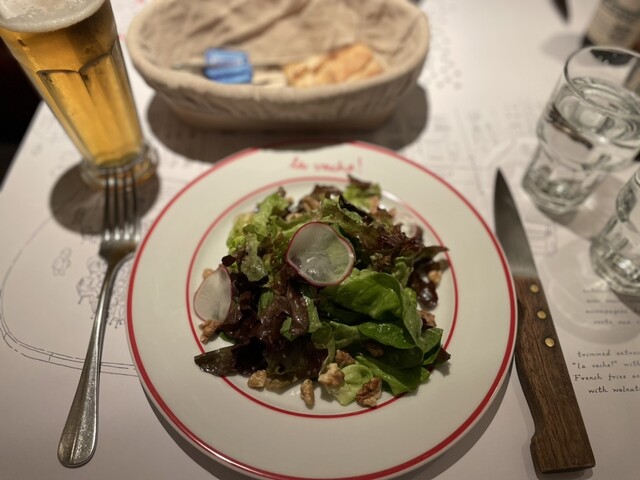 平日の昼、SOHOの「La Vache!」へ。夜は賑やかなこのエリアも、ランチタイムはほどよく落ち着いていて、店内は半分ほどの入り。赤いレザーのソファ席、壁に並ぶアート、ほどよくクラシックなビストロ感...