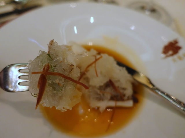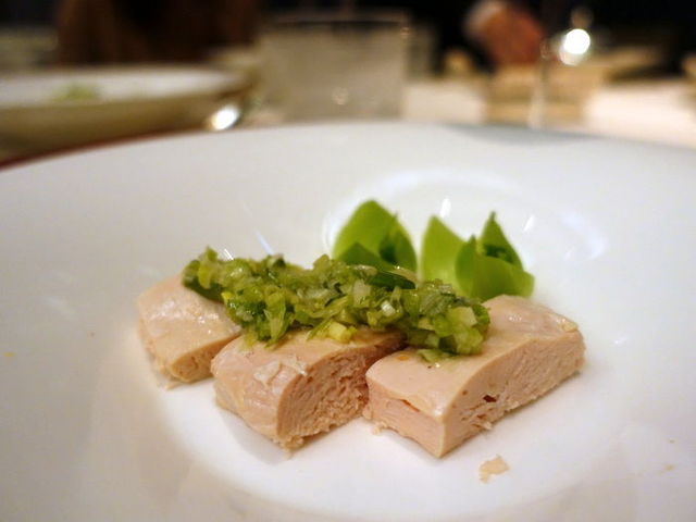鶏胸肉のコンフィでしょうか。しょうがのきいたタマネギでいただきます。