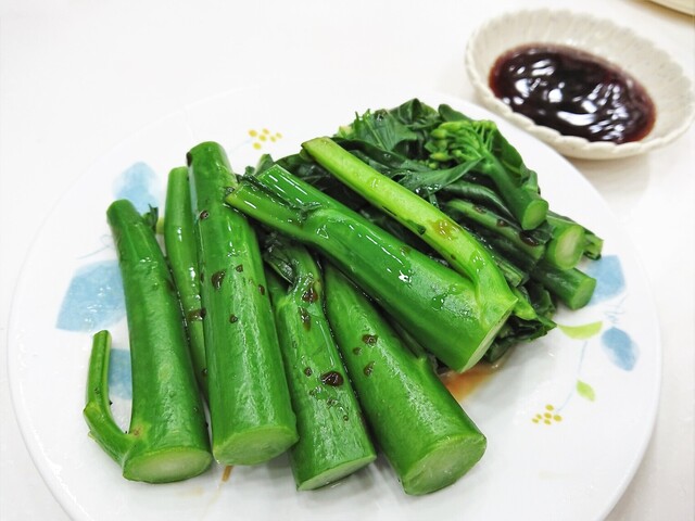芥藍 [発音≒カイラン/クアイラン] は、ケールの一種でブロッコリーの原種。茎の部分はコリコリと食べ応えがあり、葉の部分はほろ苦くておいしい。オイスターソースをつけていただきます。