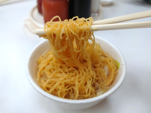自家製の全蛋麵は、コシがあってパツッとした歯ごたえ。この麺を食べると「香港だなぁ」と思える独特な麺。