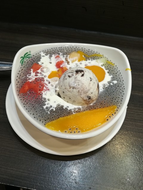 ココナッツ、ポメロ、マンゴー、タピオカが合わさったスイーツ。...