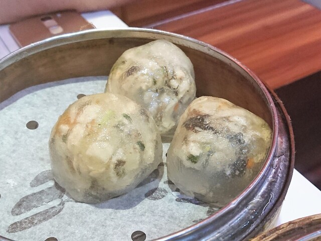 片栗粉・浮き粉で出来た半透明のモチモチ皮の中に、いろいろな野菜が詰まったヴィーガン點心。うすら味であまりおいしくはない。