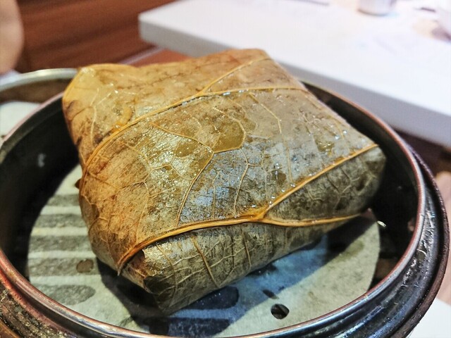 はすの葉に包まれた鶏ちまき。モチモチ食感の糯米(もちごめ)に、やわらかい鶏肉、塩漬け卵黄、豚挽肉、栗などが入っています。ずっしり重くボリューム満点。伝統的な味。