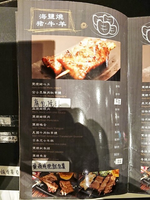 メニューは、広島県産殻付き焼き牡蠣、鹿児島県産黒豚串焼き、宮古島産黒豚串焼きなどの日本産食材や、アメリカ産アンガスビーフ串焼き、海鮮焼き、野菜焼きなどなど。