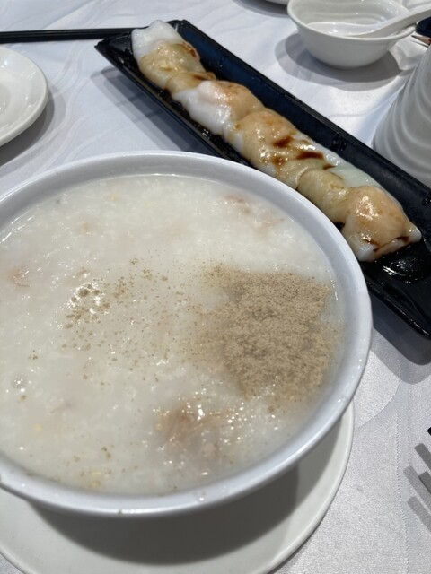 まずお粥、鶏肉とピータンが入っていい塩加減。定番の焼売や餃子もプリプリ。叉焼饅の餡は、甘くてとろけそうな豚肉。他には湯葉蒸し、腸粉、大根餅に山竹蒸。どれも、最高!いい朝ごはんでした。お腹いっぱい!