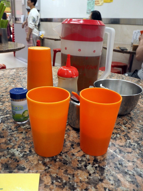 お店は、トラムの通る德輔道沿い(山側)にあります。丸テーブルにプラスチックの椅子というカジュアルなお店です。テーブルの上には、箸、レンゲ、そして、無料のお茶、「煲仔飯」にかける醤油だれが用意されています。