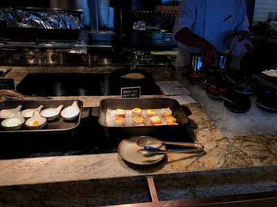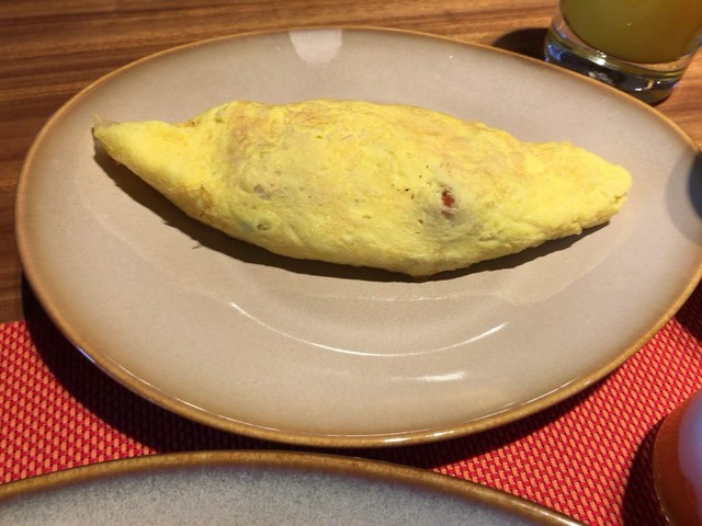 オムレツ(アスパラ、サーモンも具である)のオーダーサービス、ローストポーク?のカットサービス
