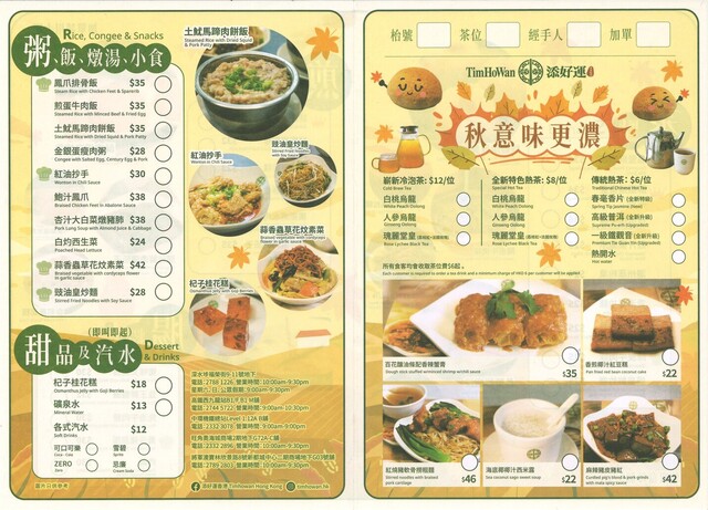 メニューは、蒸點(蒸し)×9、煎炸點(揚げ)×6、腸粉×5、粥・飯・燉湯・小食×10、甜品×1、季節限定×5の計36品。5年前と大きく変わったところはなし。単価は1.3~1.5倍くらいにアップ。
