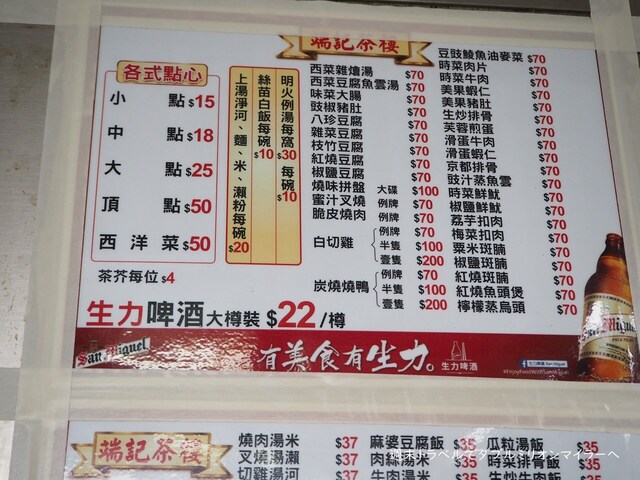 6品でお腹は満足、お会計をして朝食飲茶は終了です。壁にはお値段が掲示されています。点心は、ひとつ15ドル~50ドル。器で料金が決まっているようで、スタッフにお会計をお願いすると、テーブルにあるお皿を見ながら代金を計算してもらえます。ちなみに、点心以外の一品料理はスタッフにオーダーしてつくってもらうお料理、西洋菜50ドルとあるのが、クレソン炒めです。ご飯もの、麺ものなども揃っています。一度も注文したことがないのですが・・・