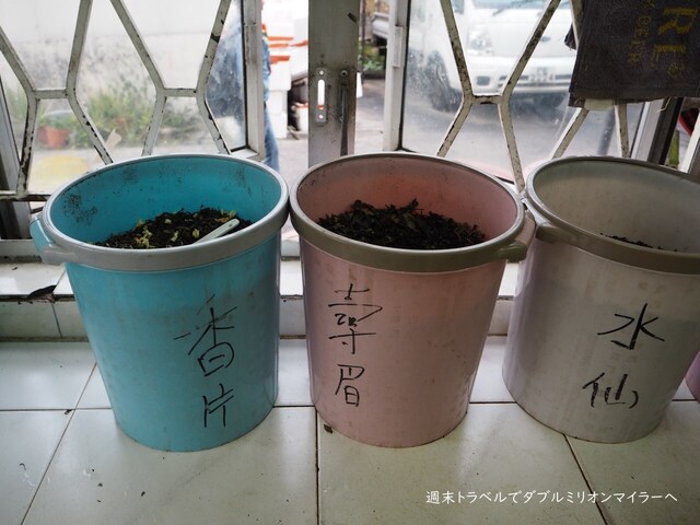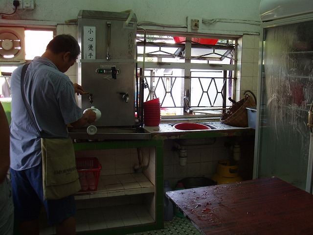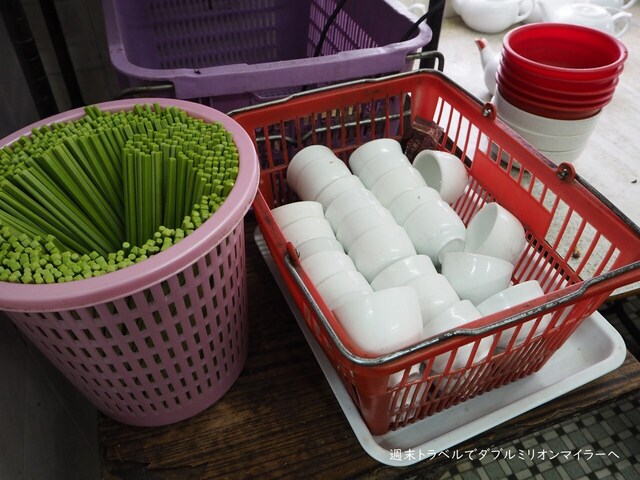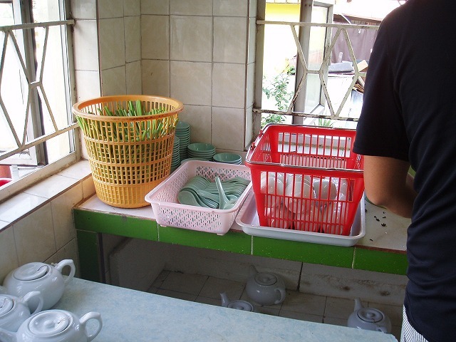 ポットを取って、茶葉を選び、お湯を注いでお茶を作ります。手前に見える赤い器は、洗杯用のボールです。このボールにお皿、湯飲み、箸などの食器を入れ、お湯をボールに注いで洗杯をします。お茶はバケツのような大きな入れ物に入っています。左から、「香片」(ジャスミンティ)、「壽眉」(白茶)、「水仙」(青茶・ウーロン茶)がありました。日本人にとって飲みやすいのは「水仙」、我が家は「壽眉」が好きなので、「壽眉」にしました。ポットを取り、茶葉を選んでポットに入れ、右側にある湯沸し器から熱湯を注いでお茶を作ります。湯飲みと箸もありますので、ここから人数分を取って席に持っていきます。