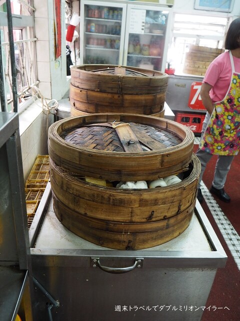 その後は、料理台へお料理を取りに行きます。揚げ物系。春巻き、タロイモコロッケ、揚げ焼売、肉餅揚げ・・・どれも美味しそう。蒸篭がうず高く積まれています。中身は、ふたを開けて確認。好きな蒸篭を持っていきます。(ちなみに、同じ列であっても、必ずしも同じお料理ではないことがあります。お気に入りの飲茶が見当たらない時は、下の蒸篭の中身を見てみることをお勧めします。)厨房をのぞくと、大きな蒸篭にたくさんの点心が並べられて蒸されていました。点心の数に驚きます。このほか、御飯もの(蒸飯、もち米など)や大根餅などの焼き物が並んでいる台があり、そこから好きなものを選んでテーブルに運びます。